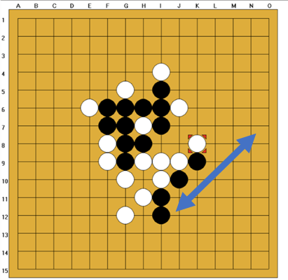 [그림 13]을 보면 g8, m8에 의해 가로 방향이 완전히 막혀있음을 알 수 있다. 이 경우 착수하여도 세로 방향을 먼저 막은 다음, 막을 길이 존재하므로(즉 무적수가 아니므로) ‘3-3’ 금수 조건에 어긋난다. 그러므로 착수가 가능함을 알 수 있다.