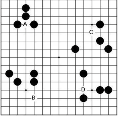 [그림 2]에서 A, B, C, D 모두 흑이 3-3인 자리로, 해당 자리에 착수했다고 가정하고 한 칸의 공백까지는 연결된 자리로 본다는 것을 알 수 있다.