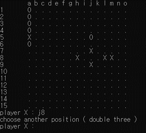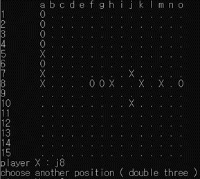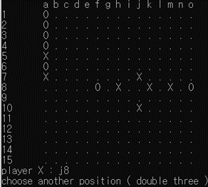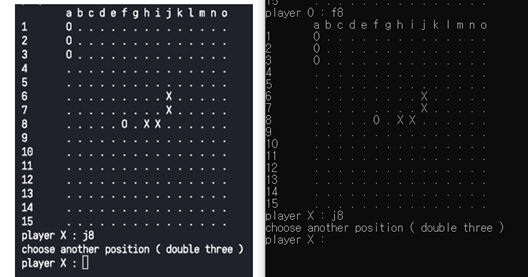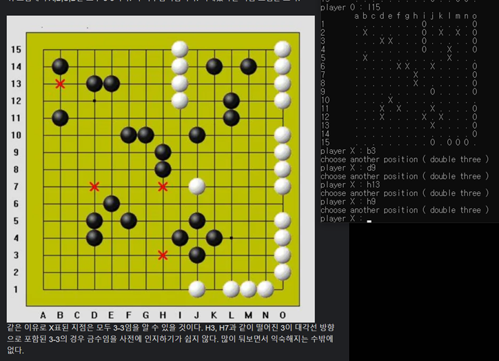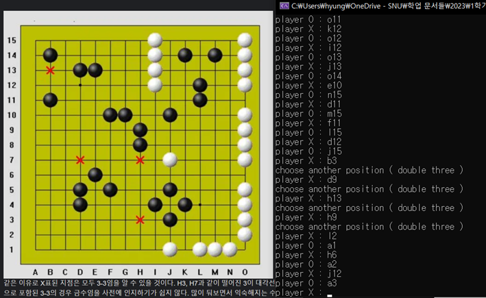 [그림 9]에서 알 수 있듯이 b3, d9, h13, h9에 대해 금수 자리를 정확히 파악하고 double three 에러를 띄우는 모습이다. ([그림 9]에서 오목판의 경우 행 번호 indexing이 반대여서 헷갈릴 수 있으나 16-행번호 로 두 관계를 변환할 수 있다.) 이 때 l2, h6, j12와 같은 점들은 금수처럼 보이지만 ’3-3’이 아니어서 금수가 아니기 때문에 해당 자리에는 착수가 가능함을 알 수 있다.