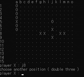 만약 또한 (row, col)의 자리가 0이 아닌 경우에는 다른 돌이 이미 놓아져 있는 경우이므로, placeOccupied() 함수를 호출하고 false를 반환한다. 마지막으로, 현재의 차례가 X(흑)의 차례이고, ’3-3’조건을 만족하는 경우 (isDoubleThree() 함수에서 true가 반환된 경우) doubleThree() 함수를 호출하고 false를 반환한다.