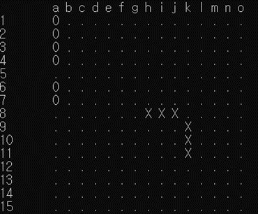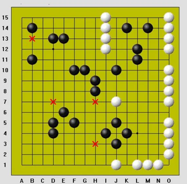 [그림 3]에서 X표시된 곳은 모두 흑돌이 3-3 금수인 경우이며, 헷갈리는 경우는 H10, L14, J4로 이 위치에 흑돌은 착수가 가능하다. H10의 경우에는 3-3이 아닌 4-3으로 가로방향에서 open-4를 만들게 되므로 4-3이다. L14와 J4는 같은 이유에서 3-3이 아닌데, L14의 경우에는 L14에 흑돌을 착수하고 J14나 O14에 흑돌이 착수하여도 한쪽이 막혀있으므로 open-4를 만들지 못해 3이 아니다. 같은 이유에서 J4또한 세로 방향으로 2개의 수로 open-4가 될 수 없으므로 3이 아니므로 금수가 아님을 알 수 있다.