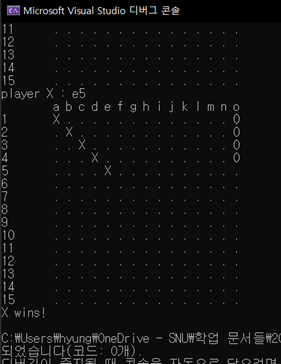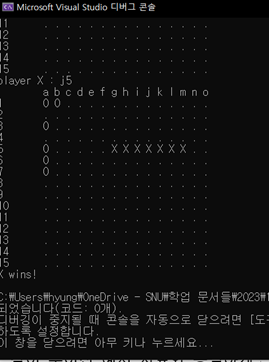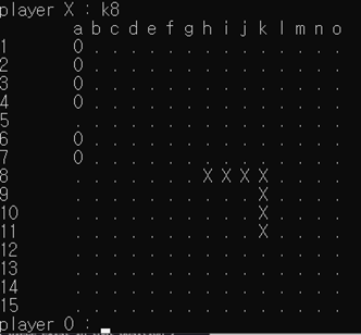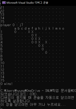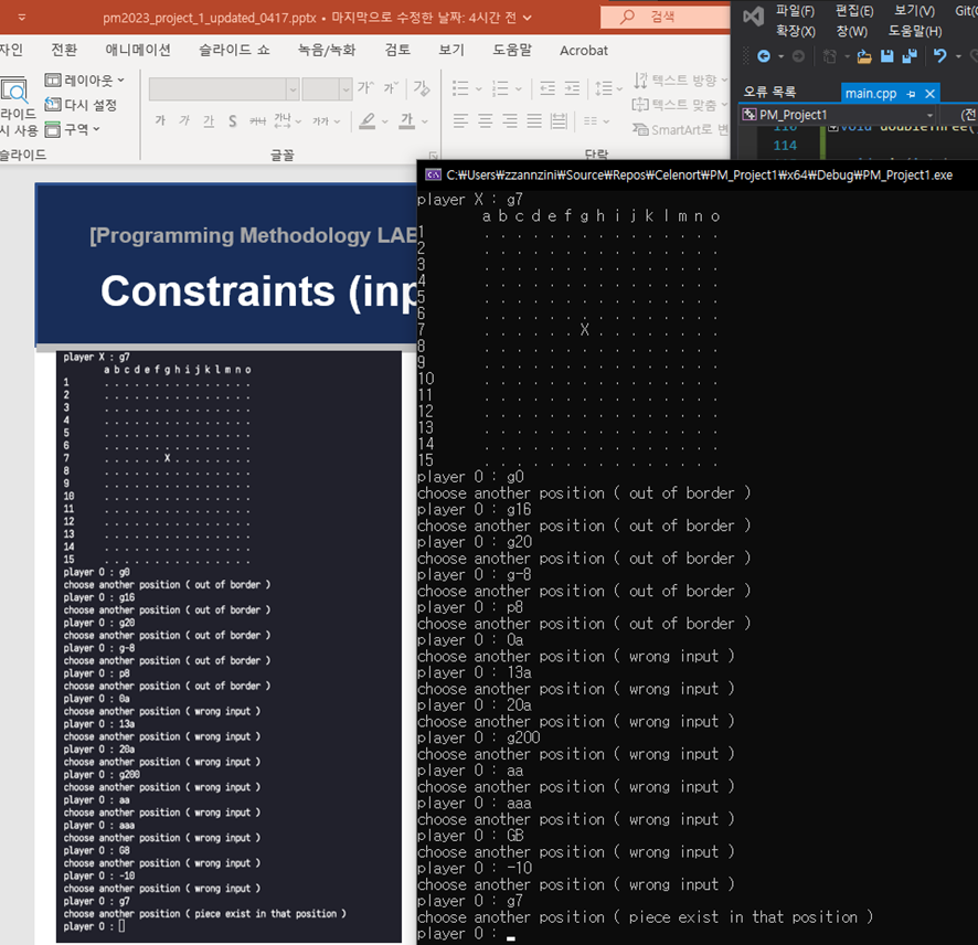 또한 문제 조건에 의해 ‘p’ ~ ’z’의 문자열이 입력된 경우는 wrong input이 아닌 out of border 에러로 간주하게 되므로, 0< row < BOARD_SIZE 조건과 더불어 out of range 문구를 띄우게 된다.