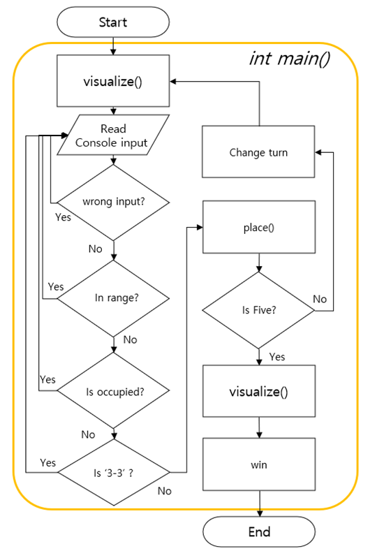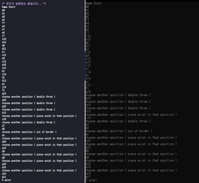 먼저, visualize() 함수는 콘솔 창에 오목 판을 표시해주는 함수이며, 이를 거친 뒤 흑돌 먼저 착수하게 된다. 이 때 입력 받은 좌표가 잘못되었거나(wrong input), 범위를 벗어났거나(in range), 이미 돌이 착수된 곳이거나(is occupied), 혹은 ‘3-3’ 조건을 만족하는지(is ‘3-3’) 확인하여 만약 이 중 하나라도 걸리는 부분이 있다면 다시 input을 받는다. 모든 조건을 만족한다면 해당 수를 착수하여 승리하는지(is five) 확인하고, 착수하게 된다. 마지막 수가 아닌 일반적인 경우에는 착수 후 턴을 바꾸어 visualize() 하고, 다시 상대의 입력을 받게 되며, 게임을 끝내는, 즉 5를 만드는 수의 경우 착수, visualize() 이후 win() 함수를 통해 승리했음을 콘솔에 출력 후 함수를 종료한다.