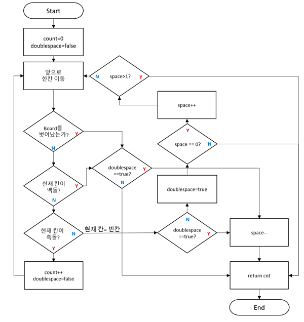 다시 탐색을 하다 Board를 벗어나거나 백돌이 발견되는 경우 그 직전 칸이 빈칸이었다면 해당 빈칸은 올바른 한 칸짜리 빈칸이 아니므로 다시 space를 되돌려주고 탐색을 종료하게 된다.