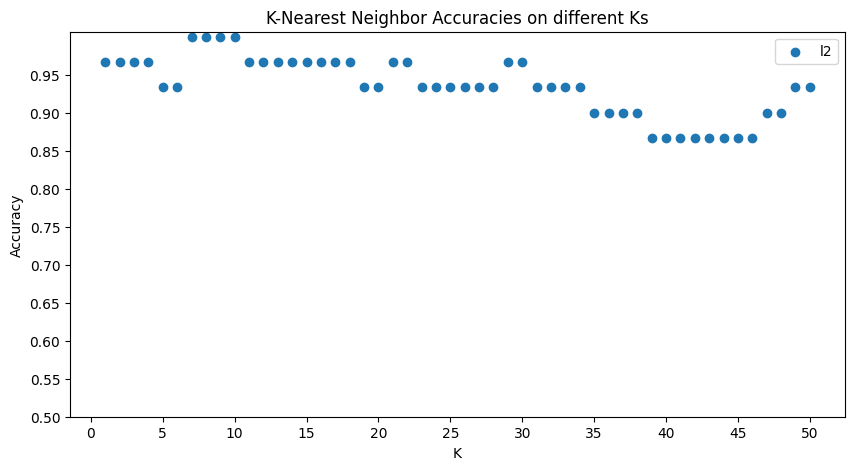 Output:running KNN with l2 distance metric processing… k= 5 processing… k= 10 processing… k= 15 processing… k= 20 processing… k= 25 processing… k= 30 processing… k= 35 processing… k= 40 processing… k= 45 processing… k= 50