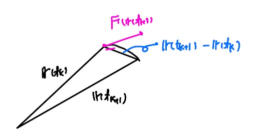 $r(t_{k + 1}) − r(t_k) ≈ r’(t_k)(t_{k + 1} − t_k)$