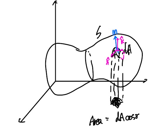 \[{\int \int }_S F_1 (dA\cos\alpha)+ F_2(dA\cos\beta) + F_3 (dA\cos\gamma) \\ {\int \int} _S F_1 dydz + F_2 dxdz + F_3 dxdy\](xy평면에 떨어진 미소영역의 그림자(정사영)은 _dA_cos _γ_임. 같은 방법으로.)