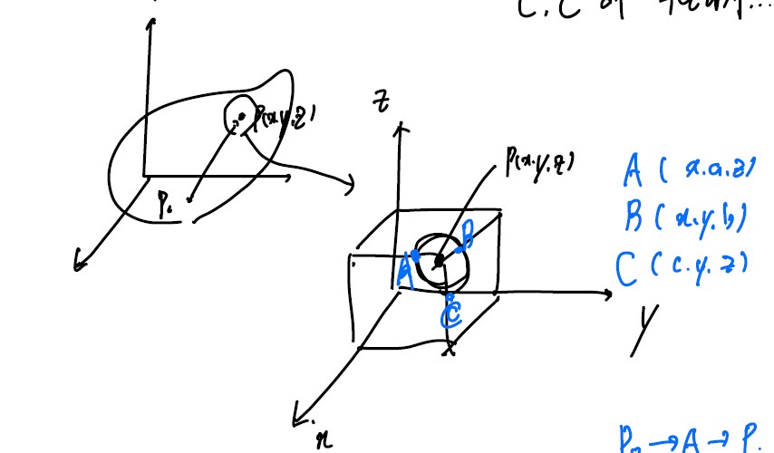 P점(종점) 주위로 cube를 생각해보자. $ A(x,a,z), B(x,y,b), C(c,y,z)$