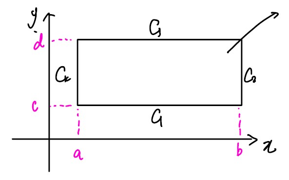 \[= \int_c^d \int_a^b ({\partial Q \over \partial x}-{\partial P \over \partial y}) dx dy =: \int\int_R ({\partial Q \over \partial x}-{\partial P \over \partial y}) dx dy\] \[\therefore \oint_C Pdx + Qdy = \int\int_R ({\partial Q \over \partial x}-{\partial P \over \partial y}) dx dy\]assumption : ${\partial P \over \partial y} , {\partial Q \over \partial x}$가 continuous