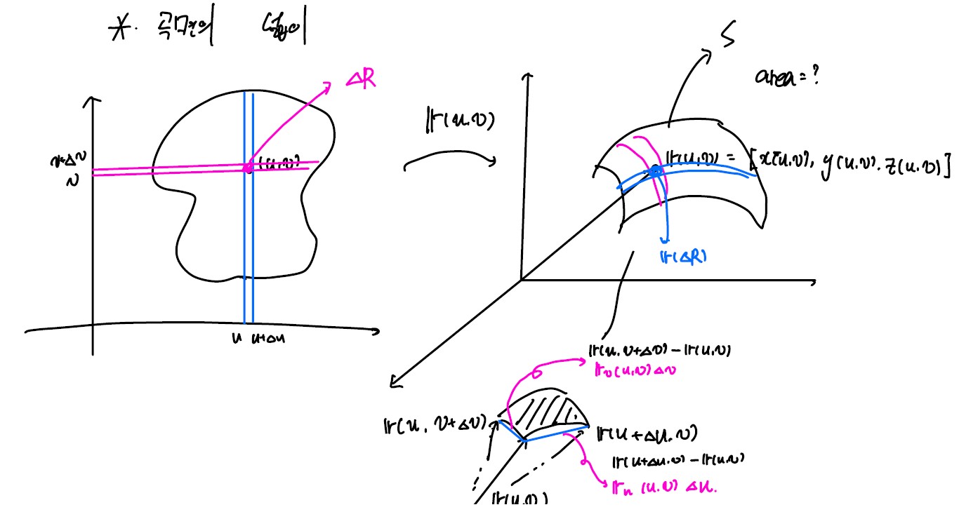 \[Area(S) = \int\int dA \\ = \lim_{\Delta u,\Delta v\rightarrow 0} \sum \vert \boldsymbol r_u \times \boldsymbol r_v \vert \Delta u \Delta v = \int\int_R \vert \boldsymbol r_u \times \boldsymbol r_v \vert dudv\]while $ dudv = dA$, element of area over S (S의 면적소)