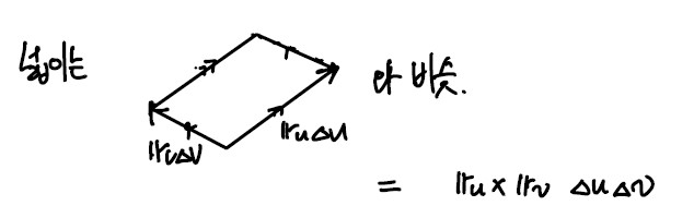 \[\boldsymbol r(u,v+\Delta v) - \boldsymbol r(u, v) = \boldsymbol r_v(u,v)\Delta v \\ \boldsymbol r(u+\Delta u, v) - \boldsymbol r(u,v) = \boldsymbol r_u (u,v)\Delta u\]이 때 넓이는 외적의 정의에 의해 두 벡터의 cross product와 유사함.