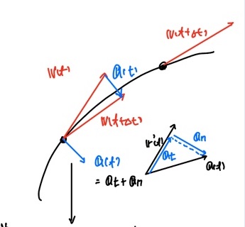 \[\boldsymbol{r'}(t) = \lim\limits_{\Delta t\rightarrow 0} {\boldsymbol r(t+\Delta t)-\boldsymbol r(t) \over \Delta t } \\ = \boldsymbol v(t) = (\lim\limits_{\Delta t\rightarrow 0} {\boldsymbol x(t+\Delta t)-\boldsymbol x(t) \over \Delta t }, \cdots, \cdots)\] \[\boldsymbol {v'}(t) = \boldsymbol r''(t) = \boldsymbol a(t) = \lim\limits_{\Delta t \rightarrow 0} {\boldsymbol v(t+\Delta t)-\boldsymbol v(t) \over \Delta t}\]a 의 방향 : 진행방향의 수직인 방향과 수평인 방향 성분으로 나뉨. (구심 가속도 생각해보기.)