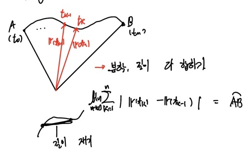 - 시점 $a = t_0$ 에서의 점 _A_와 시점 $b = t_n$ 에서의 점 $B$ 사이에서 매개변수 $t$의 구간 $[a, b]$ 를 $n$등분 하였을 때, $\overline{AB}$ 는 각각의 $n$등분된 선분의 길이의 합과 유사하다.