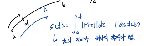 $t = a$ (시점)부터 $[a, b]$ 구간 내의 임의의 $t$에 대해 호의 길이 또한 하나의 함수가 됨, 또한 구간 내에서 함수는 멈추는 점이 없다면 ($ \boldsymbol{r}’(t) \neq 0$) 증가함수이므로 매개변수 t에 대해 일대일대응이며 역함수가 존재함을 알 수 있다.