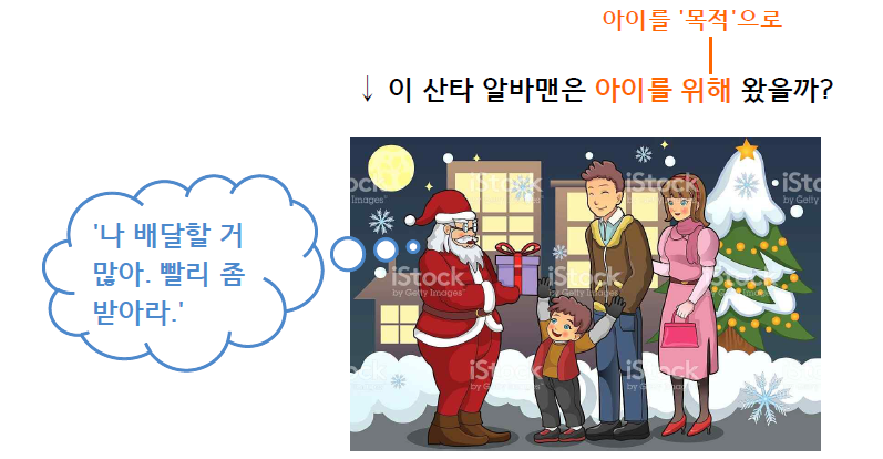 - 산타할아버지의 존재성 : 실제로 존재하냐의 여부와는 관계 없이, 나를 위해서, 내가 선물을 원하기 때문에 선물을 주는 산타가 존재해야 한다. (?)