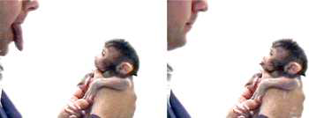 연구자가 혀를 내밀자 그대로 모방행동을 하는 출생 직후의 원숭이.