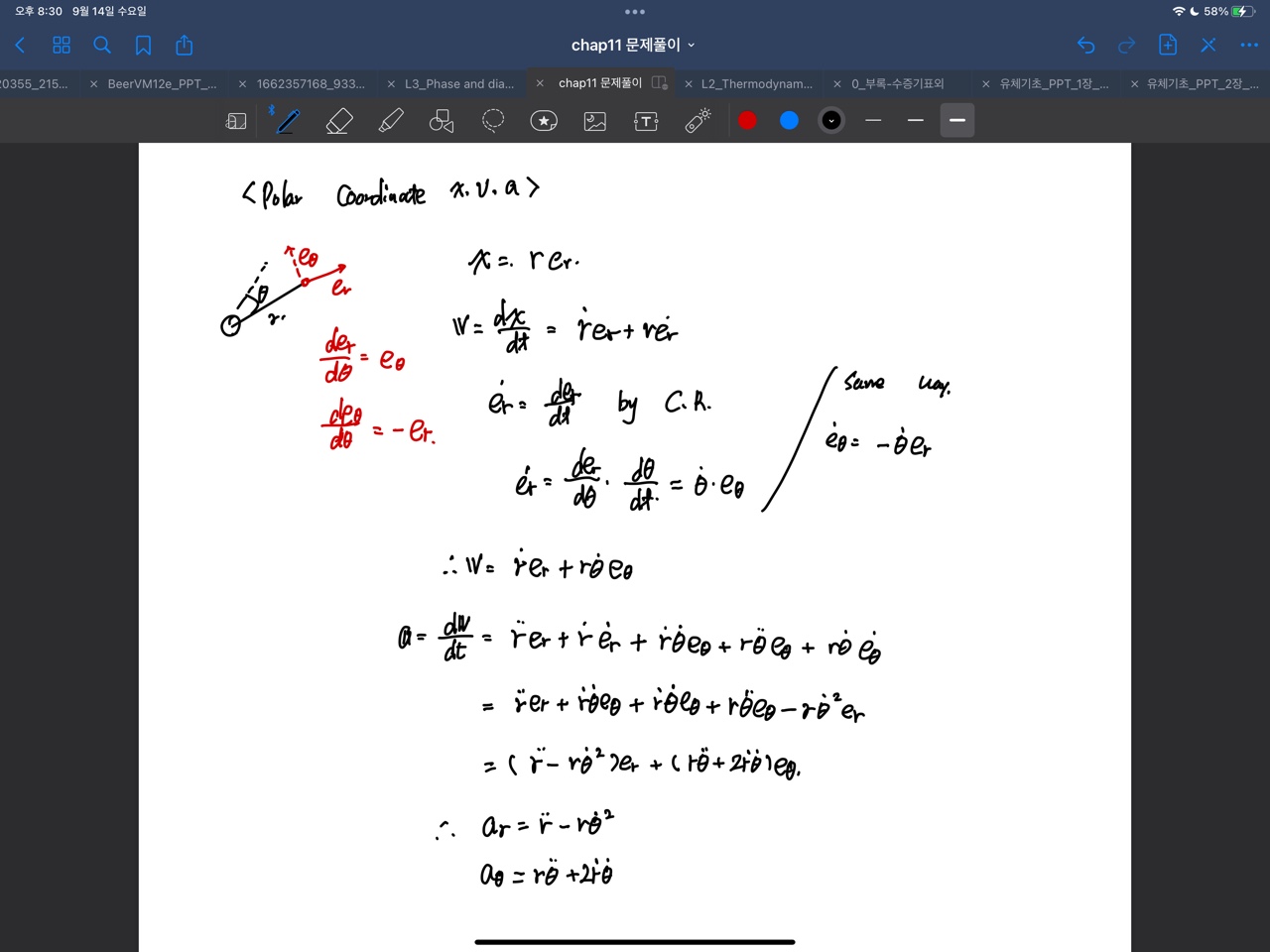 - Radial 방향과 theta가 커지는 방향을 각각 $\vec{e_r} ,\vec{e_\theta}$라고 하자.