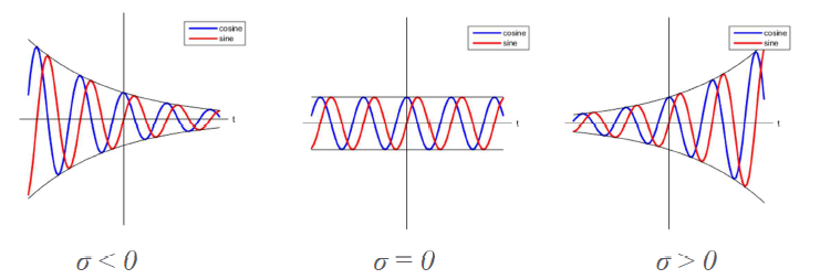 - $x(t) = Ce^{(\sigma + j\omega)t} = Ce^{\sigma t}(\cos \omega t + j \sin \omega t)$