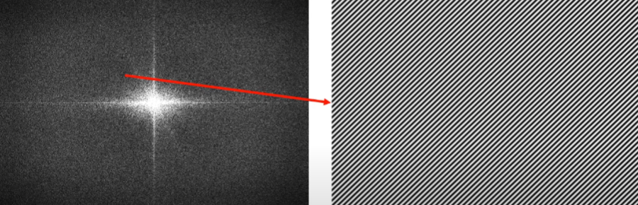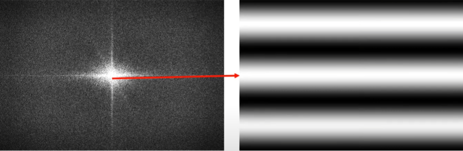 읽는 법은 잘 생각해보면 어렵지 않음. 가운데 지점은 constant이고, arbitary point를 잡았을 때 center를 시점으로 하는 vector의 방향으로 vector의 크기만큼의 Frequency를 가진 점의 밝기 만큼의 amplitude(밝기)의 wave임.