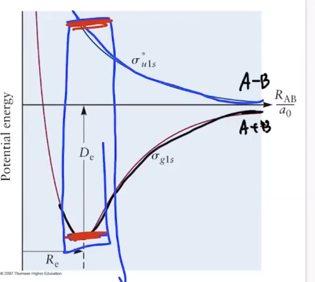 - Anti-Bonding : $\Psi_1 = A(\phi_{1s, A}-\phi_{1s, B})$ - Destructive interference of two AOs