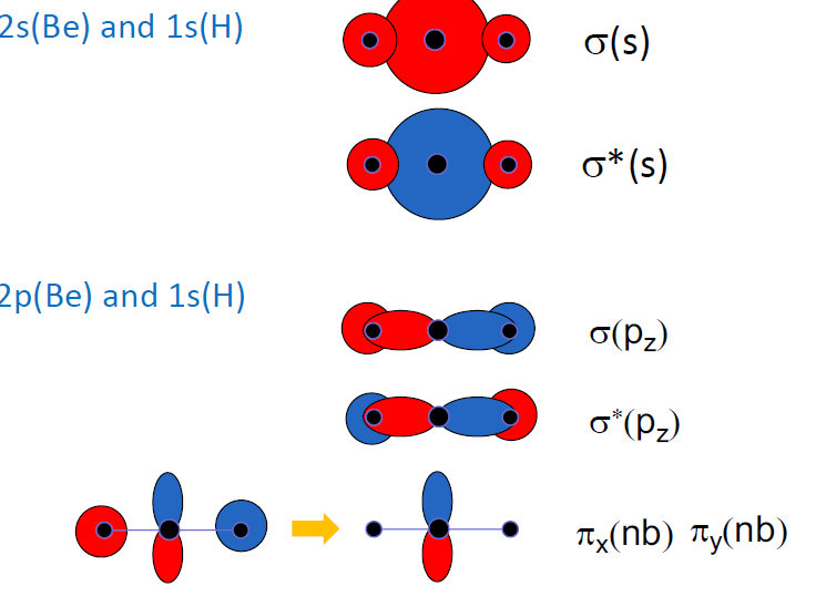 - H의 1s와 F의 2p가 에너지 준위가 비슷하므로 결합을 형성, 그 중에서 pz 만이 symmetry에 의해서 σ 와 σ_의 결합을 형성하며, 나머지 _px , py 는 non-bonding. F의 1s 또한 너무 에너지 준위 차이가 크므로 non-bonding