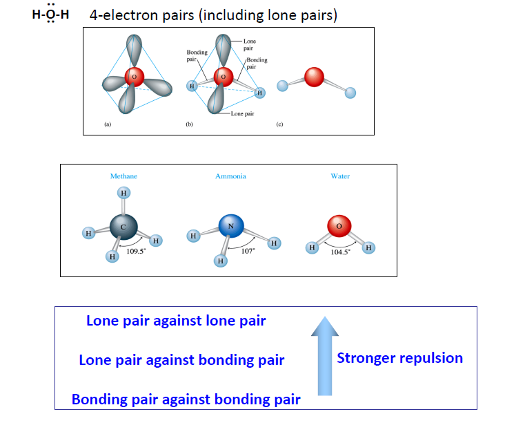 - Bonding-Bonding < Bonding-Lone < Lone-Lone : 이로인해 $H_2O$의 H-O-H 각은 104.5도로 _CH_4의 109.5도, Ammonia의 107도보다 작음
