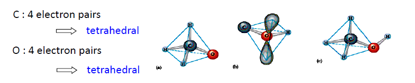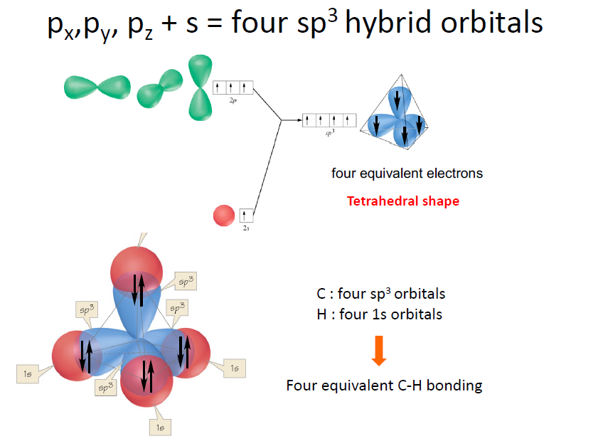 - s orbital 1개, p orbital 3개 (중심원자에서) 가 혼성화(hybridization) 되면서 4개의 동일한 _sp_3 orbital을 만들게 되고 각각에 수소 원자가 공유결합함.