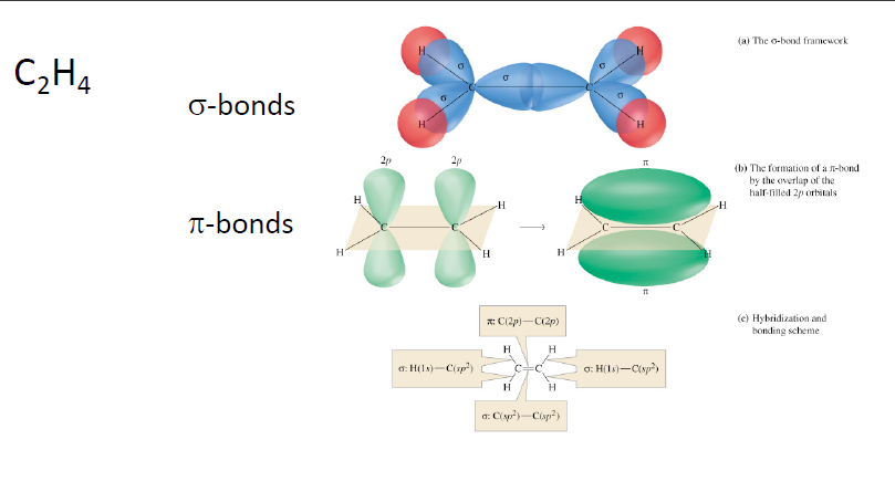- $sp^2$ 간의 bonding: s, 3 * p 중 2개의 p가 $sp^2$ 결합에 참여, 남은 한개의 p는 수직하게 p와 p간의 결합을 형성 → $\pi$ bond라고 부르며, 일반적인 $\sigma$ bond 보다 조금 약함. 그 이유는 planar node를 형성하기 때문.