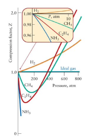 - 압력이 높아질 수록 Z는 달라짐. P가 높아질 수록 분자간의 힘, 분자 자체의 크기를 무시할 수 없게 되므로