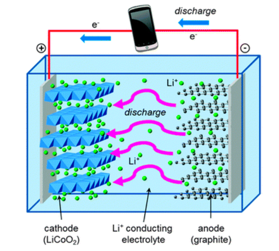 - Li+ 가 Anode에서 Cathode로 이동 (-)극에서 (+)극으로 → 중성 유지해야하므로 전자도 이동, 그런데 도선을 따라. 이 때가 방전, 에너지를 소모하는 상태. (배터리 내부에 대해서는 불안정 → 안정)