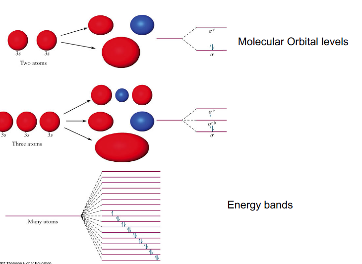 Metalic solid의 경우 원자가 매우 많으므로 orbital간의 에너지 준위 격차가 매우 작음, Band 형성