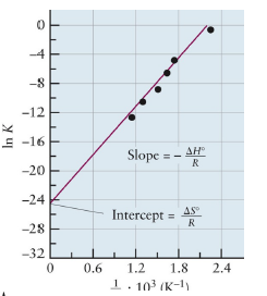 \[ln(K(T)) = -{\Delta H_{rxn}\over R} \cdot {1\over T} + \text{const}\]- 기울기에 $ΔH_{rxn}$ 이 포함되어 있으므로, 발열일 경우 slope 양수, 흡열일 경우 slope 음수