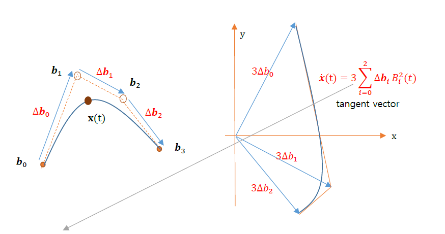 - Tangent vector is also a Bernstein with decreased degree, each control point is $n$ (original degree) times vector of original adjacent control points